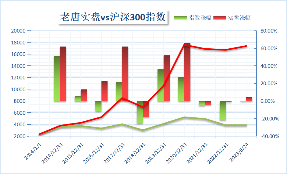 加回现金分红的沪深300全收益指数,2013年末收盘为2610.75点,今天收盘5287.74点,9.48年年化收益率7.7%;同期老唐实盘年化收益率24%。