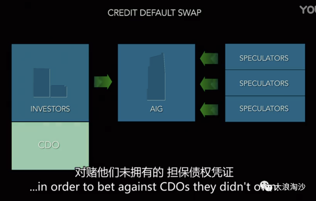 最风骚的还不止这些,AIG甚至也把这些保单做成了金融衍生品,即信用违约交换,去跟投资者对赌。如果他们赔了钱赔的不是保险公司的钱,是另一帮老百姓(投资者)的真金白银。