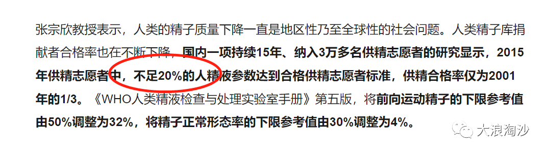 再比如四川、广东、湖北、上海等地都有专门调查,青年男性的精子合格率不足20%。有趣的是湖南调查大学生的精子合格率达到了30%,还专门发了一个“止跌回升”的喜报。